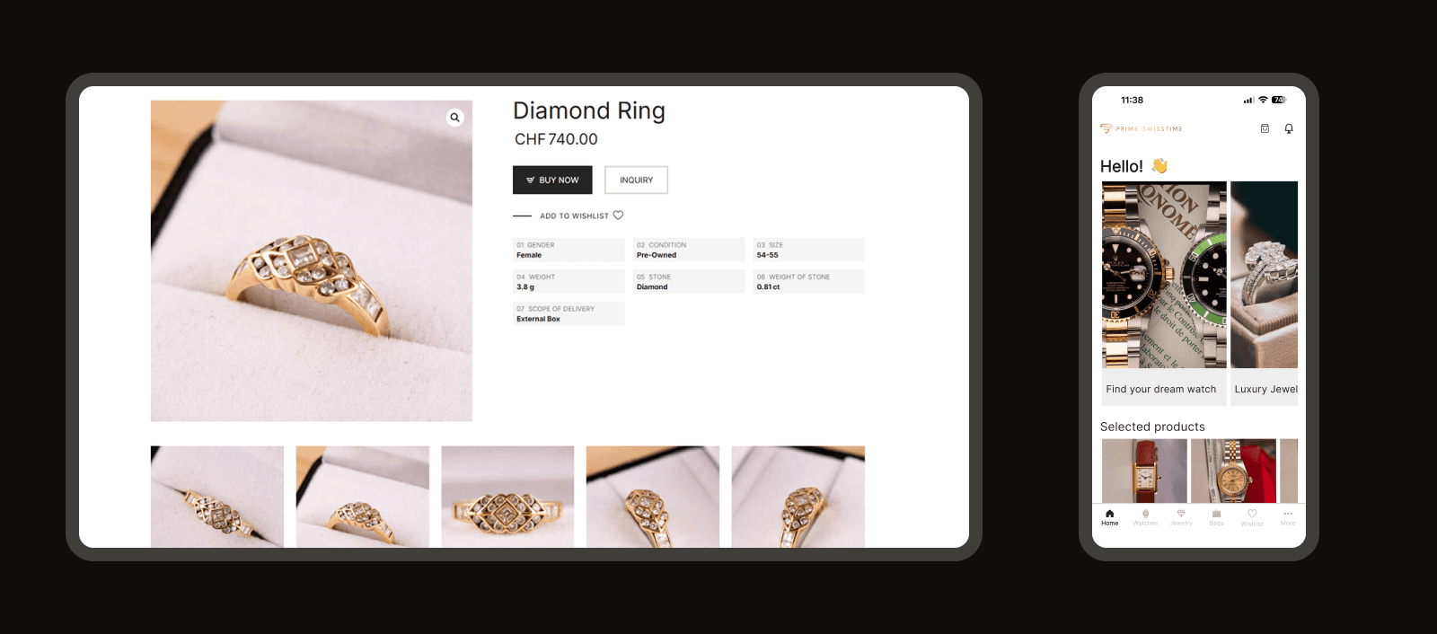 Prime SwissTime is a platform dedicated to the sale of vintage luxury accessories, including watches, jewelry, and handbags. Acting as a trusted curator, the brand sources exceptional pieces from collectors and individuals and offers them to buyers through a refined e-commerce experience. The goal was to create a modern, scalable platform that supports sourcing rare products and selling luxury goods while maintaining a premium, trustworthy user experience across web and mobile platforms.